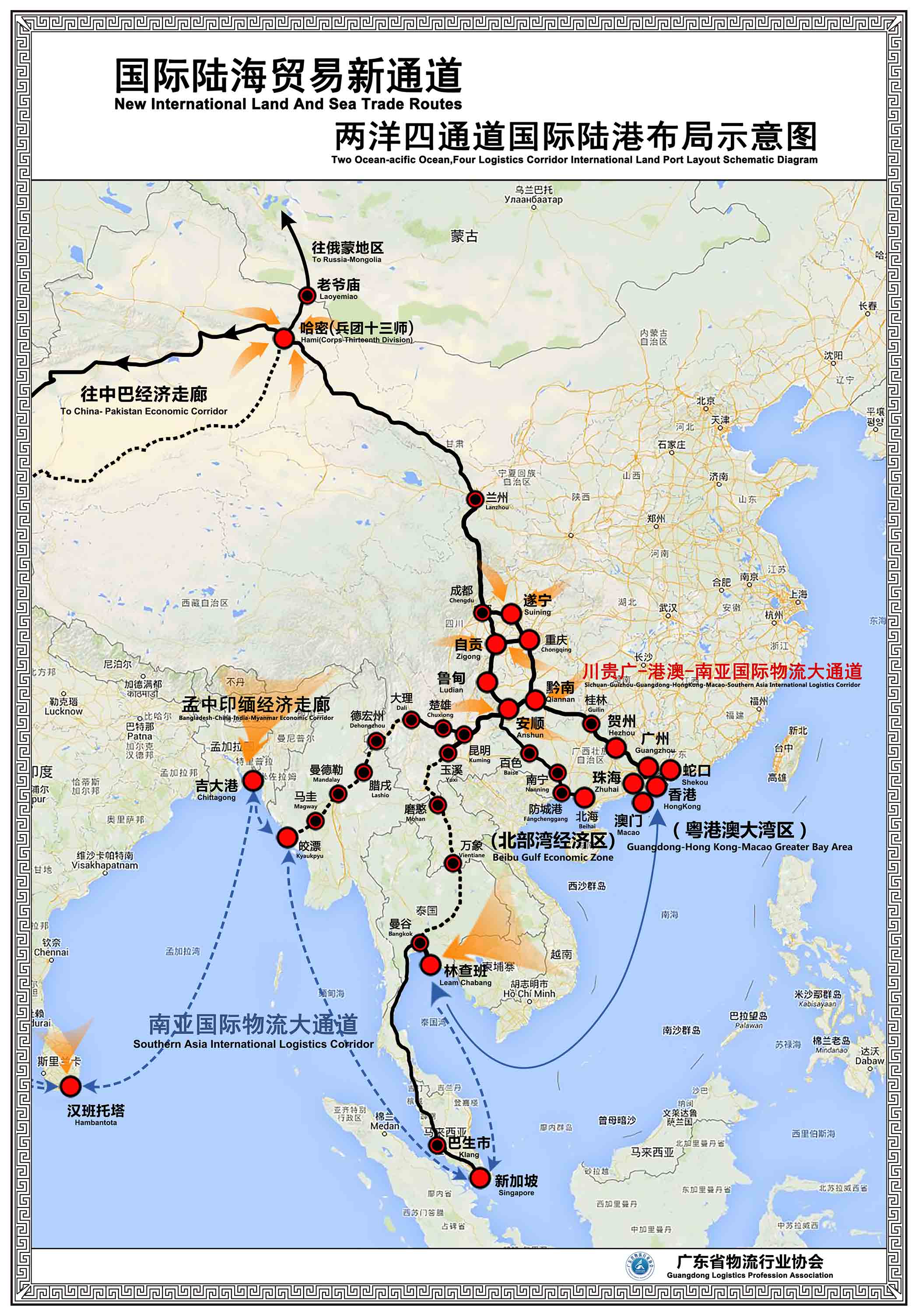 • 國際陸海貿易新通道 兩洋四通道國際陸港布局示意圖